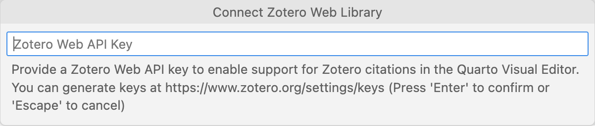 If you need to change your Zotero API key, you can always execute the Quarto: Zotero - Connect Web Library command. To force a sync of your web library, execute the Quarto: Zotero - Sync Web Library command (note that your web library is synced automatically so it is unlikely you’ll need to use this command explicitly).